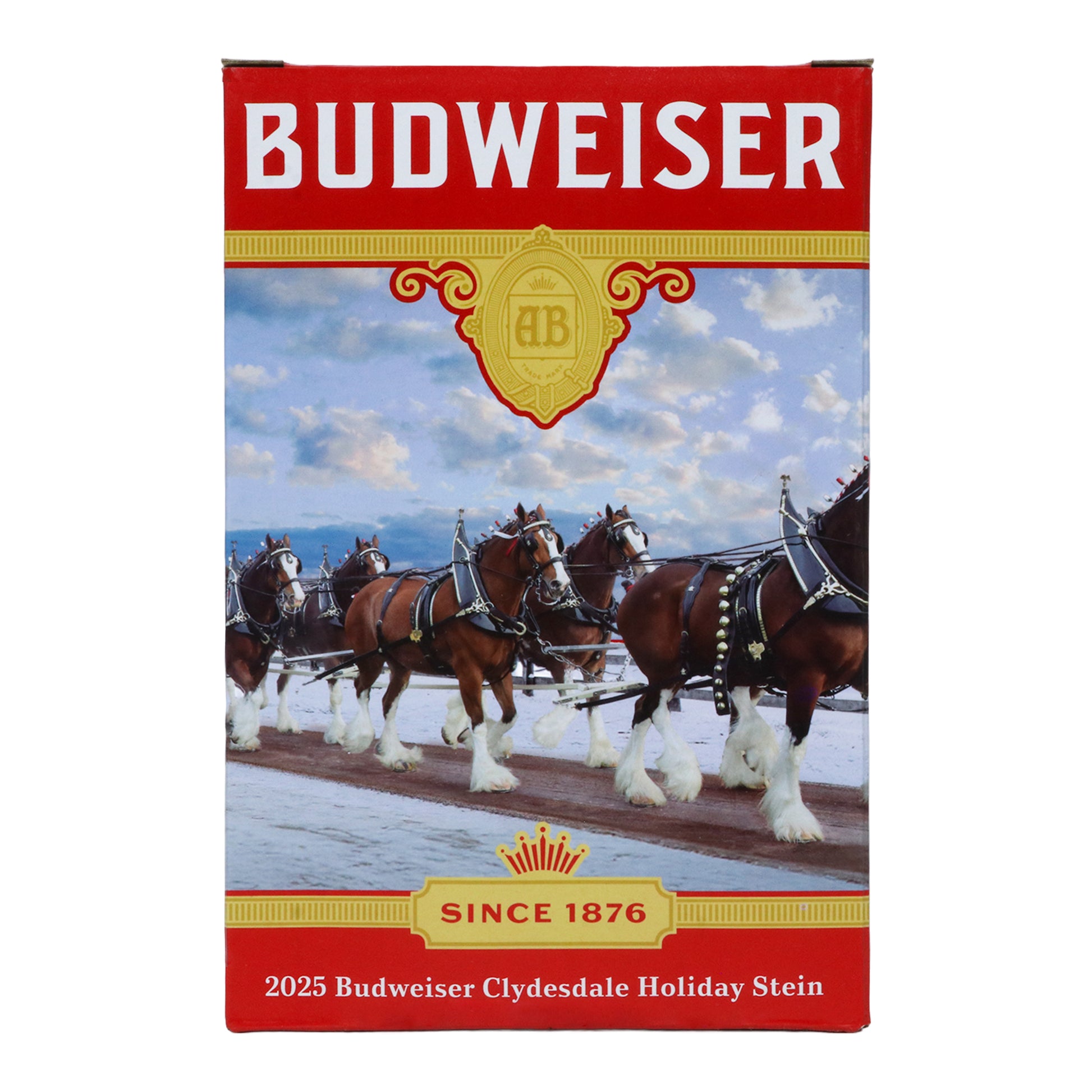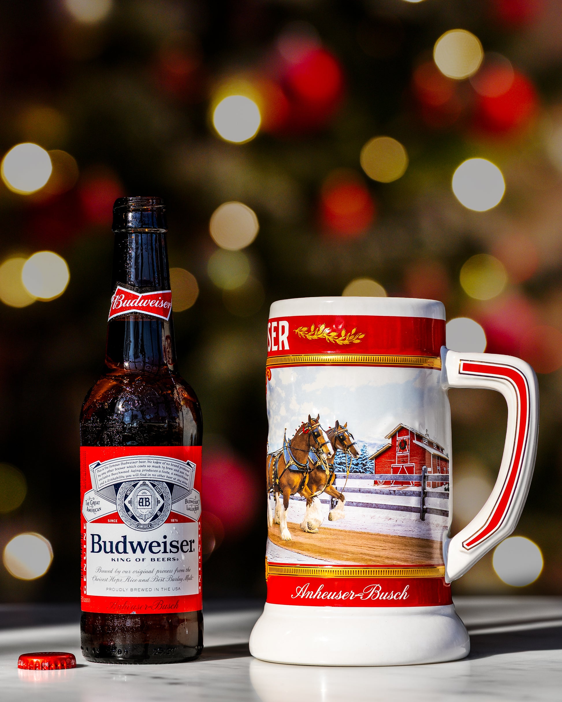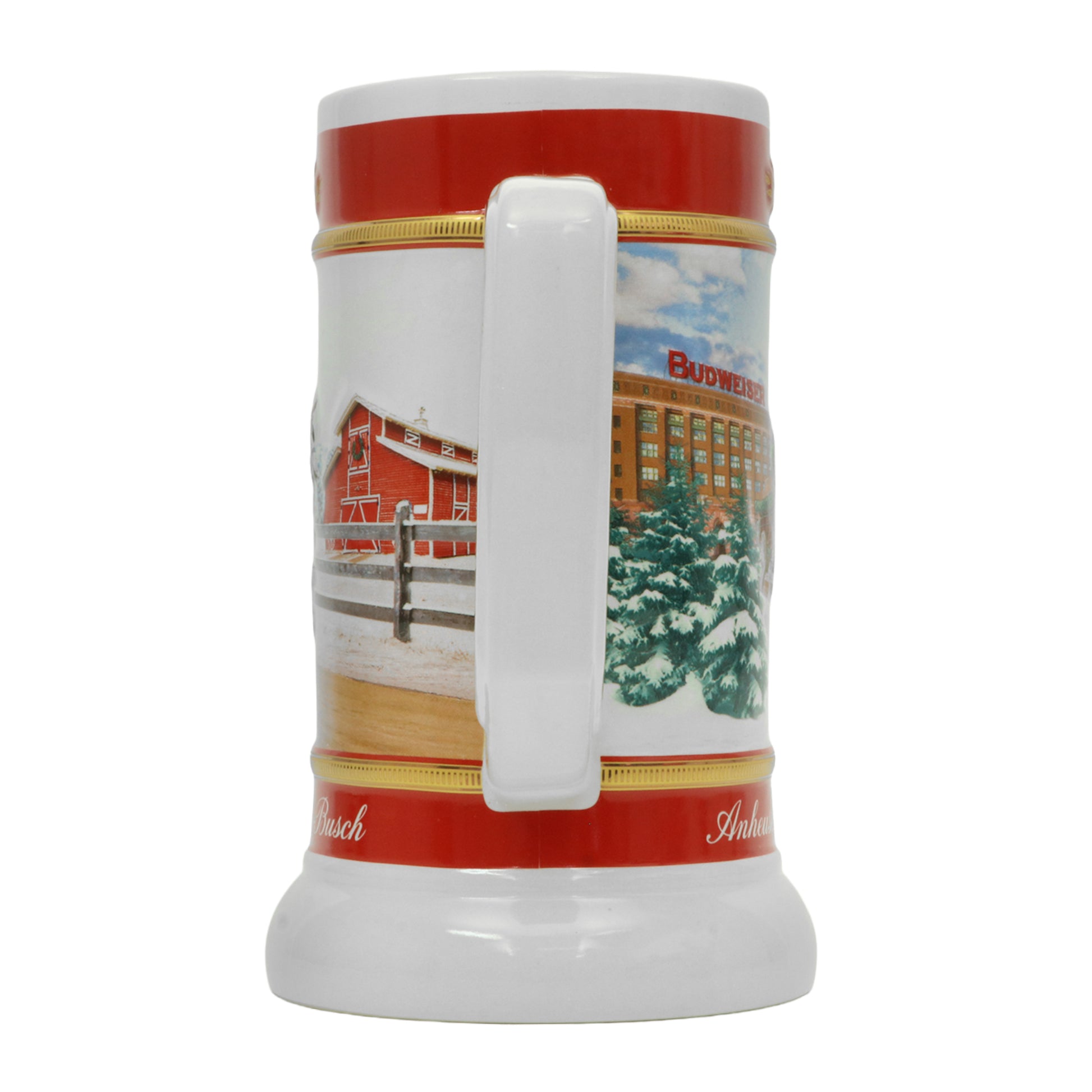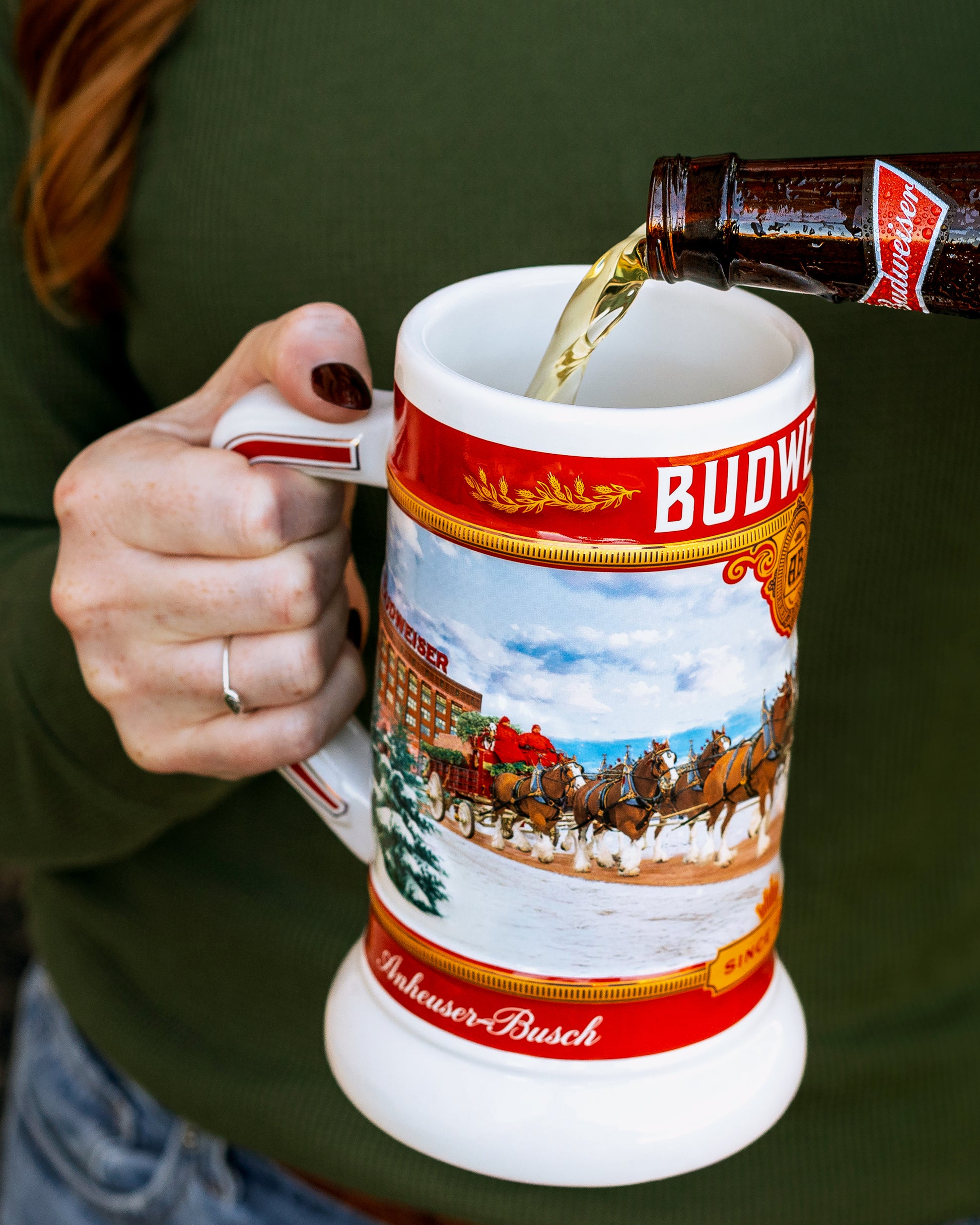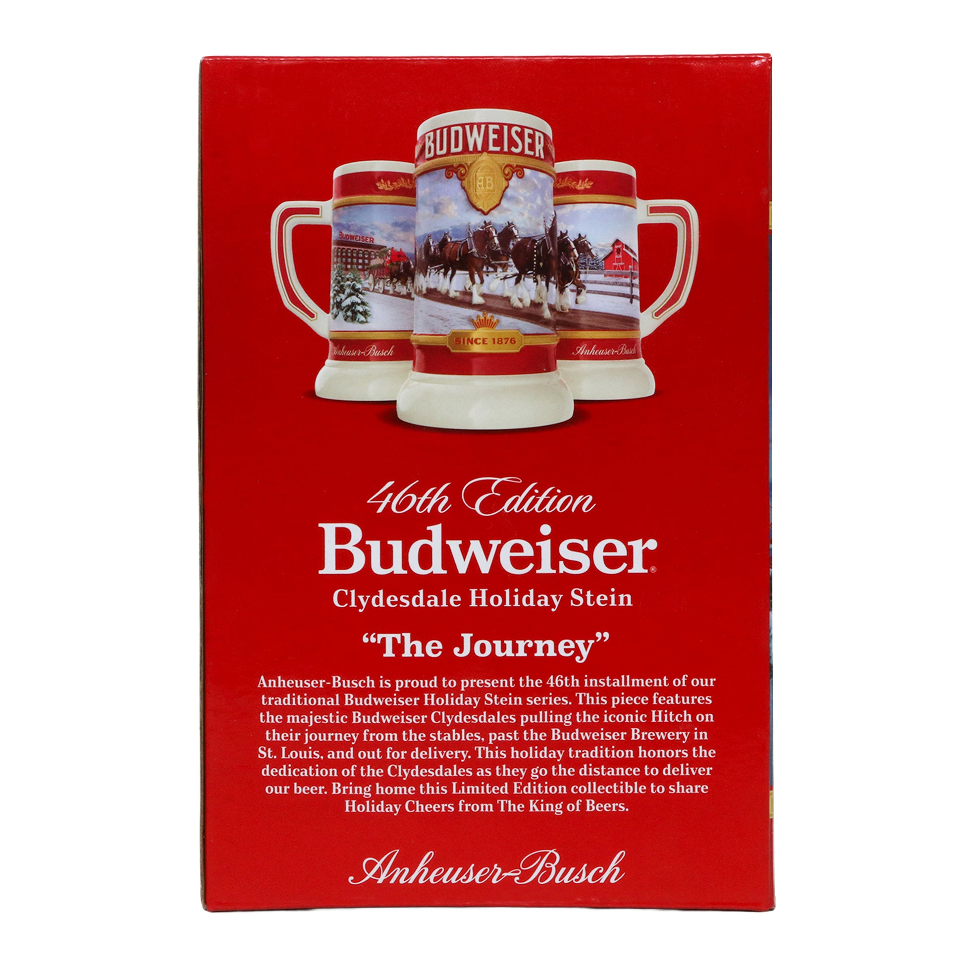 Anheuser-Busch is proud to present the 46th installment of our traditional Budweiser Holiday Stein series. This piece features the majestic Budweiser Clydesdales pulling the iconic Hitch on their journey from the stables, past the Budweiser Brewery in St. Louis, and out for delivery. This holiday tradition honors the dedication of the Clydesdales as they go the distance to deliver our beer. Bring home this limited-edition collectible to share the Holiday Cheers from The King of Beers.