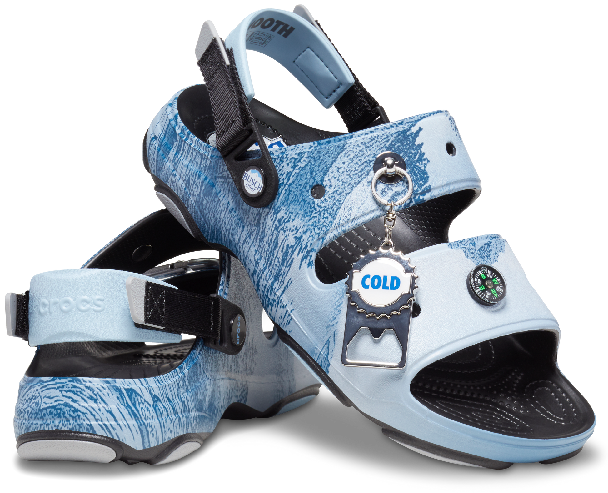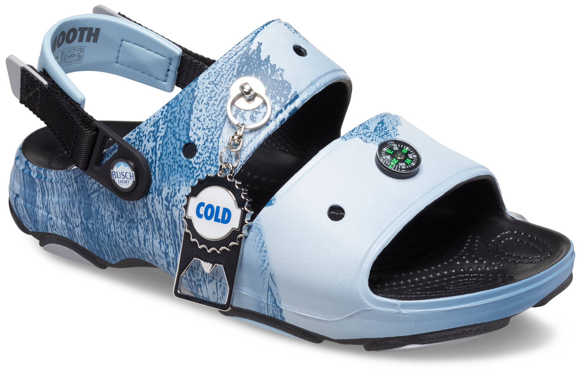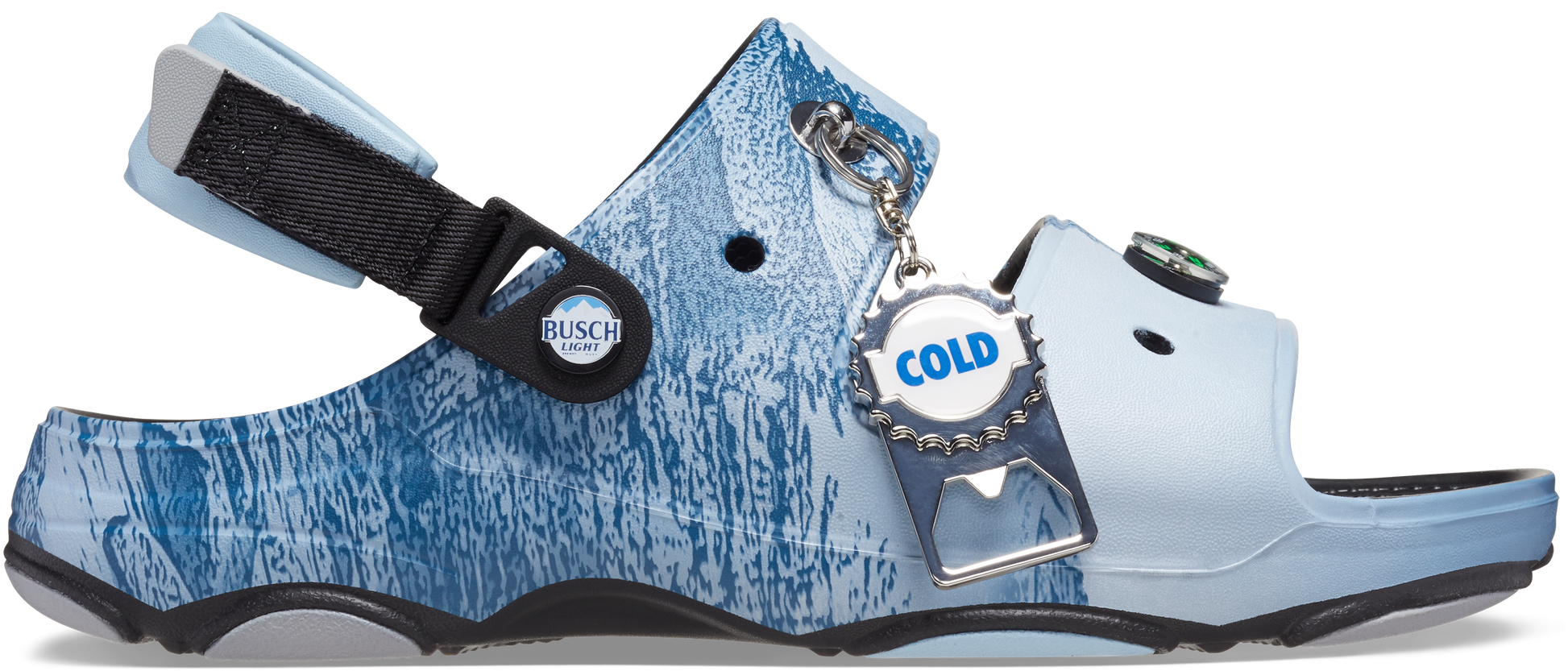 Meet the Busch Light x Crocs All-Terrain Sandal, your all-in-one companion for the great outdoors. Got attachment issues? Our carabiner's your missing link. Ready for a cold one to cool you off? The bottle opener’s on the case. Feeling lost? Not on our compass’s watch. And for those spectacular stumbles in the moonlight, we've tossed in a flashlight. Because a trip in the dark should at least be an enlightening experience.