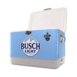 An iconic centerpiece to your Busch Light displays! This 54QT Steel Belted Cooler can hold up to 85 cans and is designed with more height than the standard cooler to hold 2-liter bottles upright and prevent spills. Additional features include leak-resistant channel drain for easy drainage, comfort-grip steel handles for effortless lifting and carrying, and a rust-resistant stainless steel lid latch and hardware to keep the contents of your cooler safe and secure.