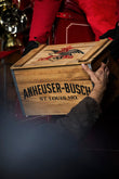 Vintage hand crafted beer crate. This box is individually crafted from pine and is stained in a warm brown stain. Features a hinged top which is emboss printed with Anheuser-Busch A&Eagle . The front is emboss printed with the original embossing plates Anheuser-Busch and St. Louis, MO. The ends are also emboss printed and are strapped with steel banding and oval headed nails to provide beauty and strength and features routed hand holes.