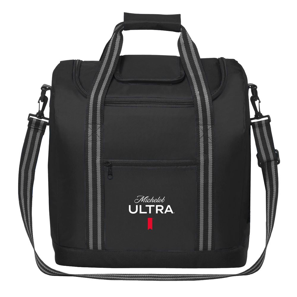 70-denier nylon with 600-denier polyester bottom and PEVA lining. Features easy access top flap with hook-and-loop closure, zip opening, front zip pocket, side mesh pocket, side pocket for cell phone and other accessories, 22" handles with padded closure, and adjustable/removable shoulder strap. Holds up to 28 cans. Recommend use with reusable ice pack. 14" x 15" x 8". Screened logo. Imported.